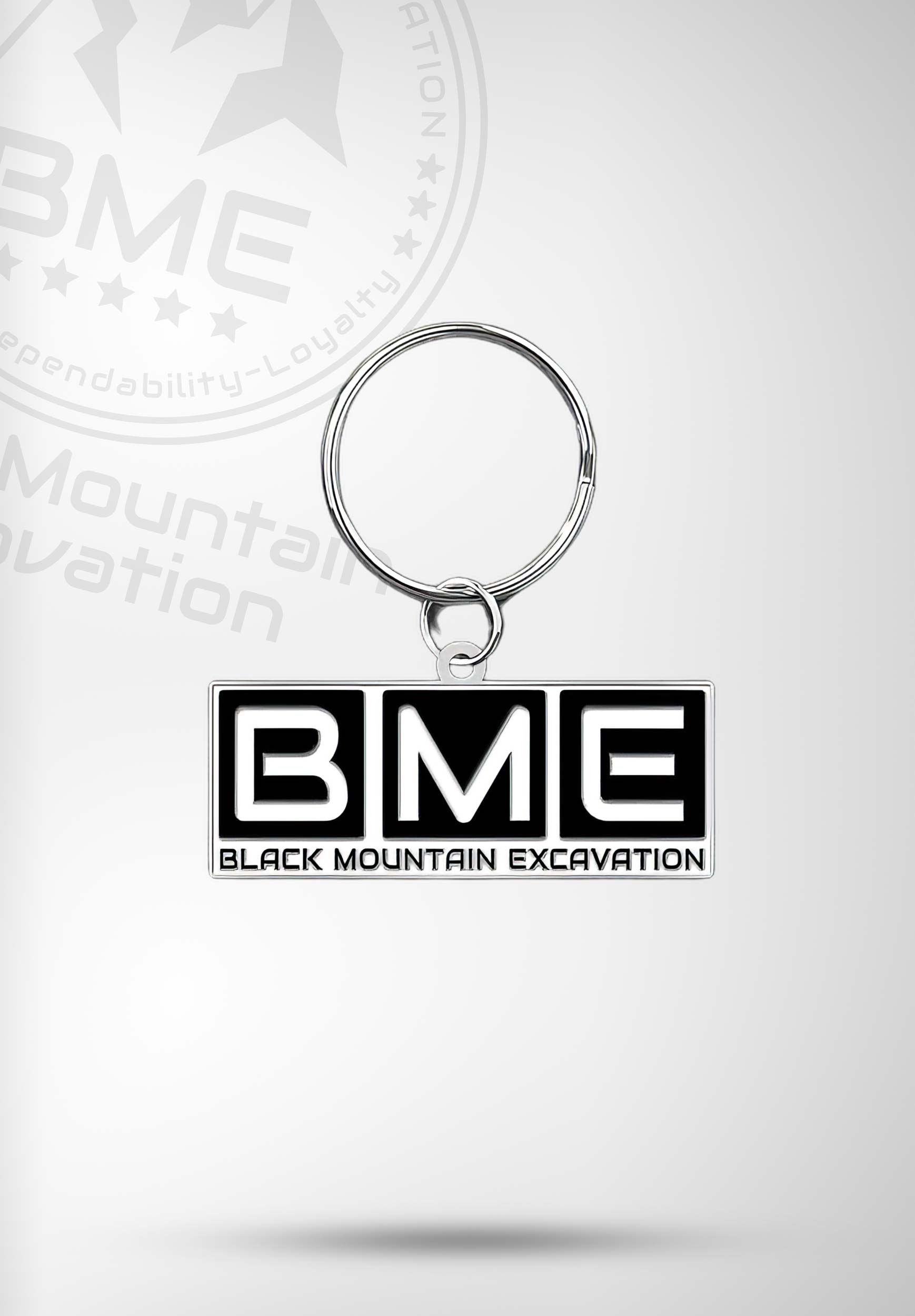 This bold black-and-white rectangular keychain features the official BME block logo with “Black Mountain Excavation” displayed below. Clean, tough, and to the point—just like the work we do. Heavy-duty feel with a polished metal edge.